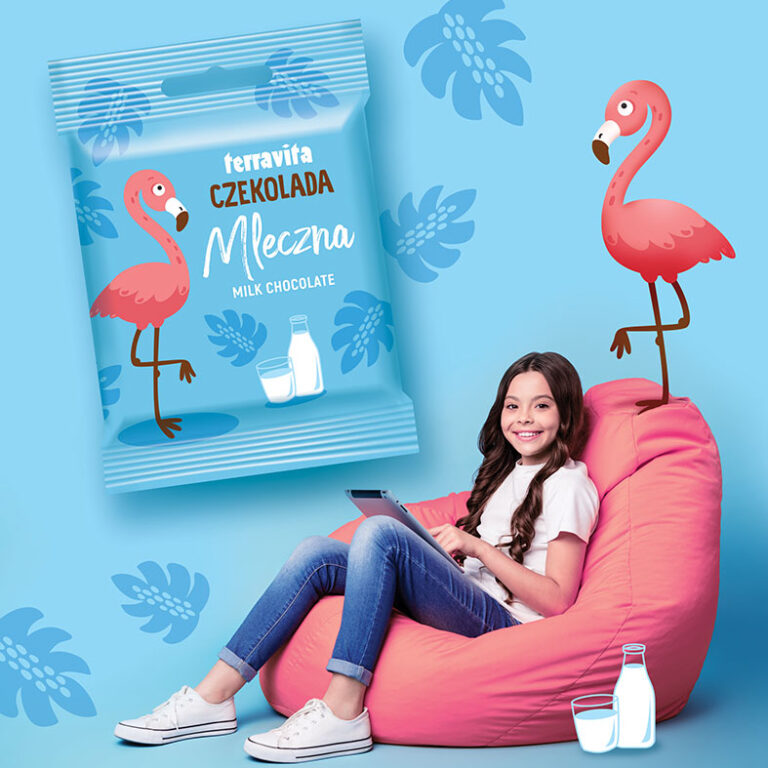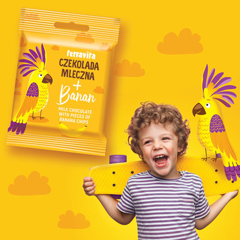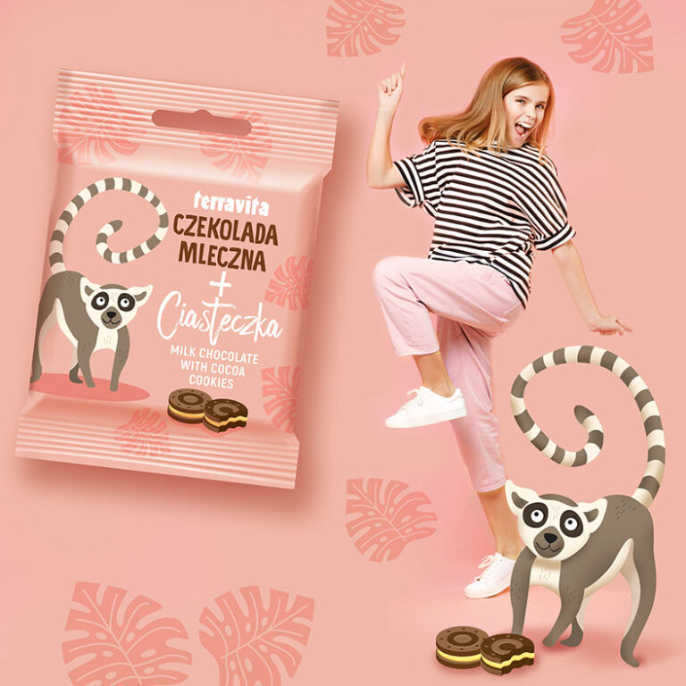 Firma Terravita zamówiła u nas projekt serii opakowań tabliczek czekolady 50g dla dzieci. Charakterystyczną cechą każdego opakowania jest dominujące, pozbawione podziałów, jednobarwne tło. Czystość kompozycji znacznie zwiększa impakt oraz pozwala walczyć z konkurencją na sklepowej półce pełnej wielokolorowych opakowań dedykowanych dzieciom. Podstawową atrakcją opakowania miała być sympatyczna postać zwierzątka współgrająca z kolorem tła oraz typografią.