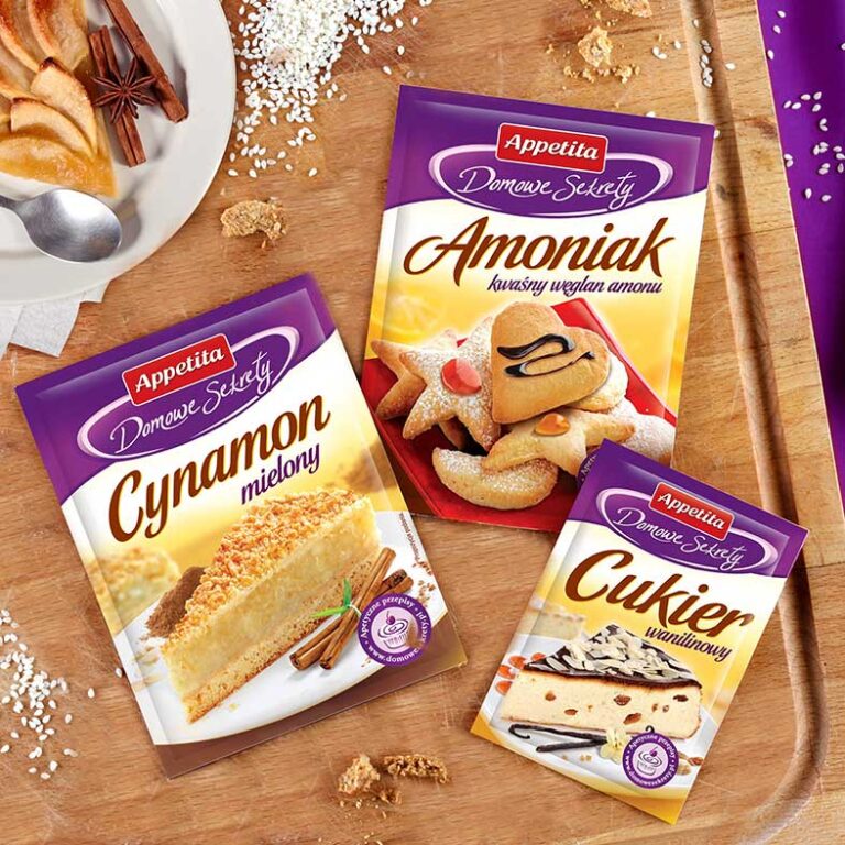 Opracowanie projektów opakowań nowej linii produktowej dodatków cukierniczych pod marką Domowe Sekrety. Kluczowym założeniem było stworzenie kompozycji graficznej określającej hierarchę poszczególnych elementów graficznych projektu oraz zastosowanie koloru fioletowego jako nowego kodu kolorystycznego w kontekście marki Appetita (kolor fioletowy wprowadzony został później na podstawowej linii produktów marki Appetita). W ramach prac projektowych naszym zdaniem było również wykonanie zdjęć kompozycyjnych produktów.