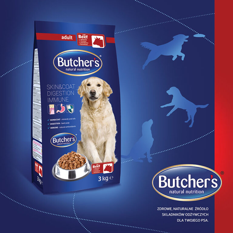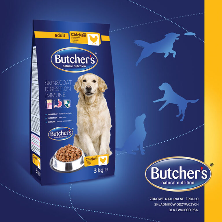 Projekt linii opakowań karmy dla psów pod marką Butcher’s prezentuje spójny układ informacyjno – graficzny. Informacje o właściwościach produktu zostały powtórzone i wzmocnione przez naniesienie piktogramów. Wizualizacja czworonoga wraz z prezentacją produktu wkomponowane zostały w łagodne granatowe tło. Panel smakowy wyróżniony został poprzez zastosowanie odrębnych kolorów przypisanych do konkretnego smaku i dodatkowo oznaczonych piktogramami.