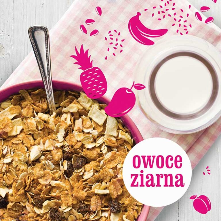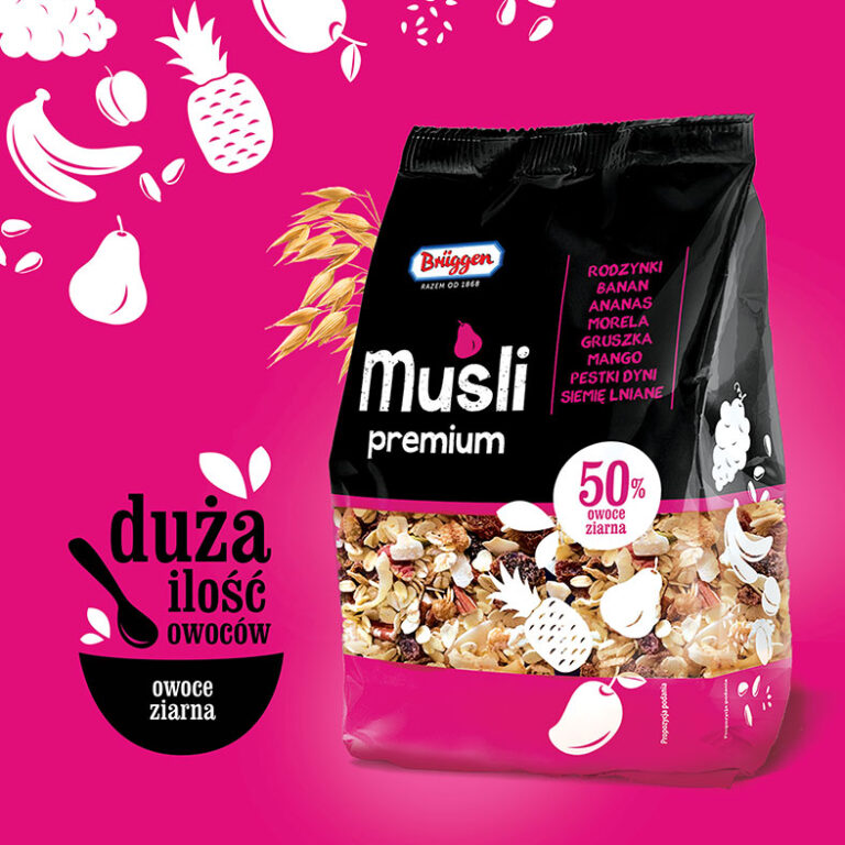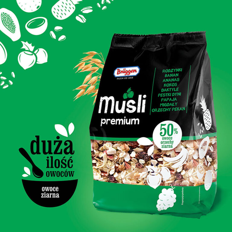 Projektując linię opakowań Musli, zależało nam na zachowaniu czystości koncepcji, która będzie kontrastowała z różnorodnością produktu w okienku. Dzięki temu uzyskaliśmy efekt, w którym produkt jest lepiej widoczny. Z kolei informacje na opakowaniu mają swoją wyraźną kompozycję i nic nie przeszkadza w jej czytelności. Piktogramy owoców na okienku łączą wizualnie przestrzeń między górnym oraz dolnym panelem projektu.